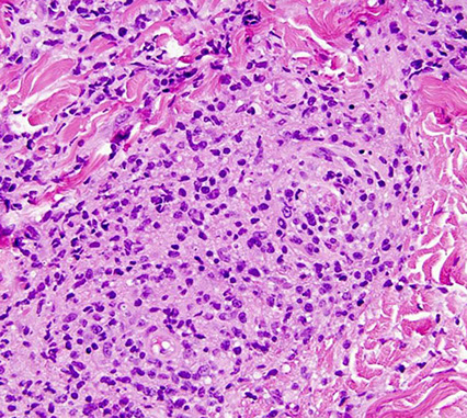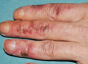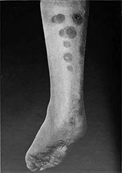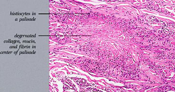 - endovasculitis in dermal vessels c endothelial cell hyperplasia and complicated by thrombosis