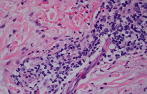 Micro: fried-egg mast cells in a reticular polka dot pattern in the upper 1/3 of the dermis