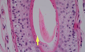 Micro: sclerotic bodies with pseudoepitheliomatous hyperplasia c intraepidermal abscess and pigmented fungal sclerotic boddies (Mediar bodies or copper penny bodies)