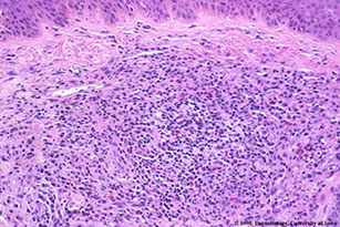 Ulcer c adjacent acanthosis over layer of fibrin, which is surrounded on both sides by granulation tissue and ectatic vessels