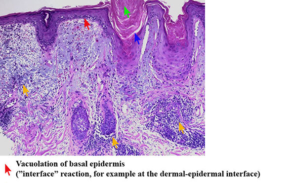 Verruca vulgaris - Prominent granular layer (red), hyperkeratosis (blue) papillomatous hyperplasia (green), inward bending of rete (yellow)