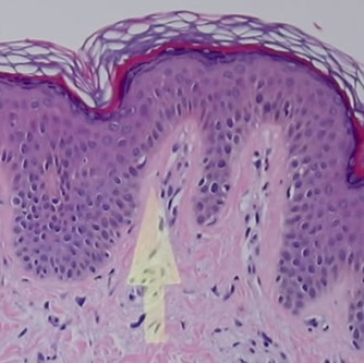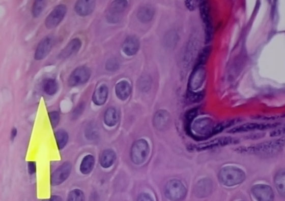 - due to shrinkage during processing, cells in the spinosum usually have a halo directly around the nucleus (bc their desmosomes are locked into a network) vs melanocytes that have cytoplasm around their nuclei and sometimes a space around the cytoplasm, bc they are not locked in by desmosomes