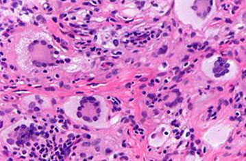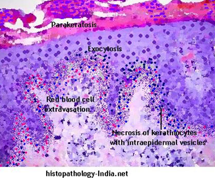 Micro: central cystic space with radiating pseudovilli made by acantholytic dyskeratosis