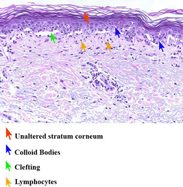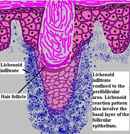 Clinically see small patches with central zone c depressed white, procelain like appearance and fine scale surrounded by narrow red or violaceous rim c fine telangiectasia