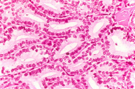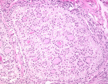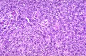 Micro: small cells with brisk mitotic activity, arranged in sheets, nests, trabeculae, or cords, with follicle-like spaces with eosinophilic to basophilic secretions.
