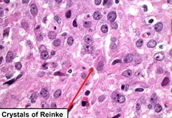 - Luteinized stromal cells: polygonal cells with abundant eosinophilic/clear cytoplasm, variable amt of fat, central round nucleus, and standout nucleolus