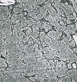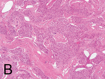 Micro: lobular (pseudolobular) prolif of cellular nodules separated by collagenous stroma