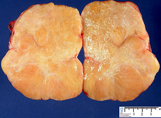 Micro: primitive germ cells and sex cord stromal cells in nests separated by ovarian-type, fibrous stroma