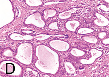 Micro: irregular tubular spaces of multiple sizes made of flat endothelioid cells, cytoplasmic vacuoles, clusters of cells; occasional big cells c red cytoplasm, sm muscle hyperplasia,