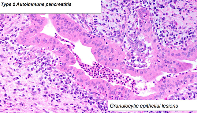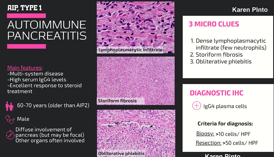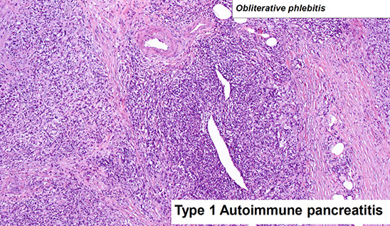 Type 1 - lymphoplasmacytic sclerosing type pancreatitis; Older pts (7th decade), usually male