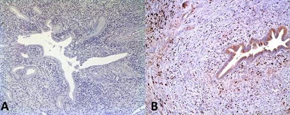 IHC: (+) SMA/inhibin /ER/PR in ovarian stroma, cytoplasmic PAS, CEA/EMA and CK 19/7/8/18 in epithelial cells