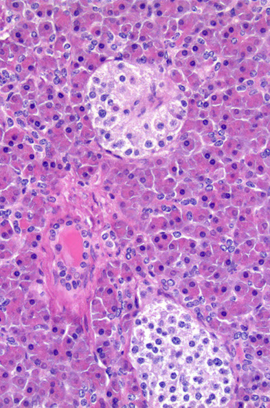 Round central nuclei c pale amphophilic cytoplasm and do not form acini, made of anastomosing cords of endocrine cells (A, B, D and F cells that each secrete their own hormones) and a vascular component