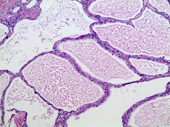 Micro: Simple cuboidal epithelial layer filled c glycogen (clear-cells)