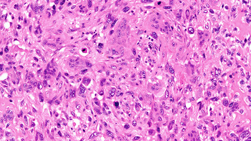 Micro: large pleomorphic spindle cells and giant cells in a background of scant fibrous stroma and hemorrhage