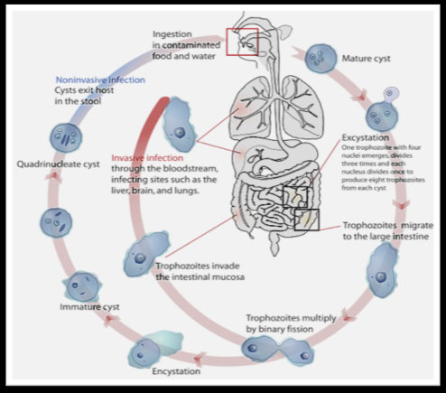 ● Humans are the major reservoir, acquired by ingestion of food and drink contaminated with E. histolytica cysts