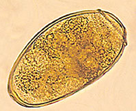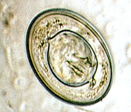 Dx: Embryonated eggs are small (27-35μm x 12-19μm), oval shaped, and have a yellow-brown moderately thick shell with a seated/shouldered operculum