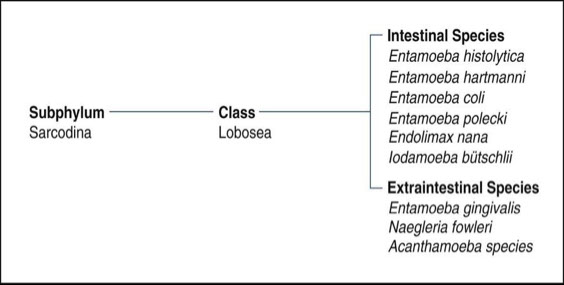(Includes Entamoeba histolytica and E. dispar. Only E.histolytica is considered to be a pathogen, E. dispar is considered a commensal)