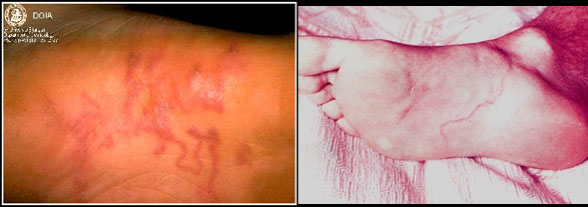 Sx; initial prickling or nettling sensation which subsides leaving a macule at each site of penetration