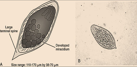 Dx: thin-shelled eggs (112-170μm x 40-70μm), embryonated, c a terminal spine