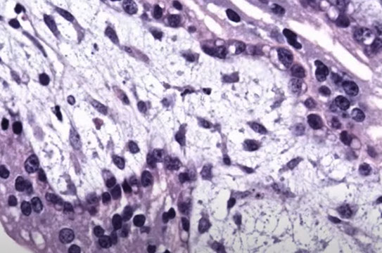 Micro: Diffuse, circumferential trophoblastic prolif of uniformly enlarged, avascular edematous villi c marked prolif or trophoblasts that can be atypical