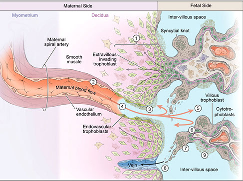 - implantation site vessels - intermed trophoblasts invade uterine arterioles and destroy muscle nd elastica; waves of invasion in first nd second trimesters; "physiologic remodeling"