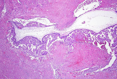 Characteristic findings in CHM with cavitation and absence of fetal vessels. Note the contents completely degenerating and filled with protein rich fluid on the left.