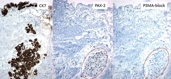 Nephrogenic adenoma: CK7+, PAX2+, PSMA block+