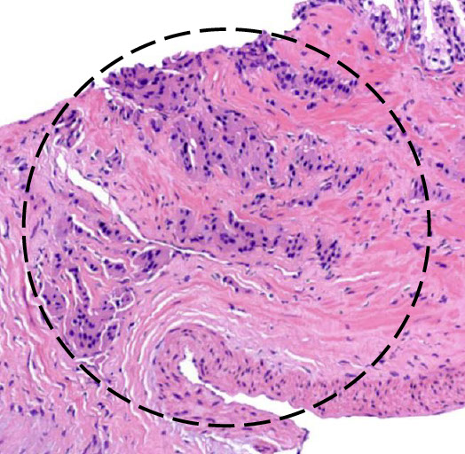 DDx: clear cell adenocarcinoma (has diffuse nuclear hyperchromasia, mits, and more extensive muscle invasion, Ki67 ~30%, p53 ~4%)