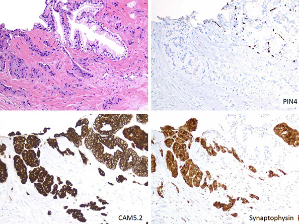 - basal cells can have prominent nucleoli, resembling high grade PIN