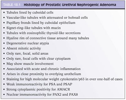 IHC: (+) HMWK (1/2+, so don't exclude if neg), CK7 (cytoplasmic, not very spec), PSA/PSAP (in 1/2, usually at least focally +), AMACR coupled c neg p63 (3/5, may mistake as prostate ca), PAX2 and PAX8 (due to origin from renal tubular cells, reliable marker to distinguish from prostate ca, which is neg)