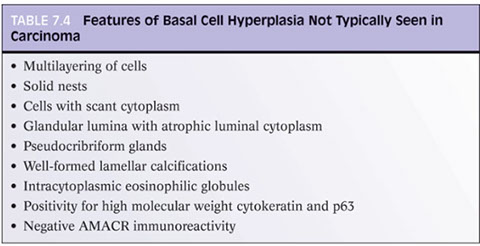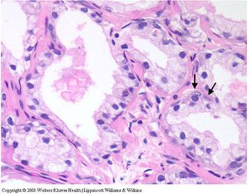 - basal cells are absent in adenocarcinoma of the prostate and can be found in conditions that mimic prostate cancer