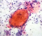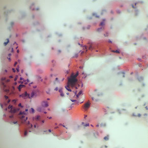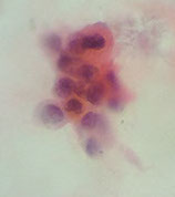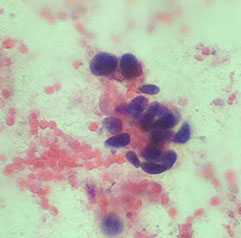 Mciro: Smooth cannon ball-like edge of cell clusters, or honey-comb sheets, papillae, acini; Nuclei are eccentric and round with finely granular chromatic and big nucleoli; cytoplasm is abundant, finely vacuolated (foamy) sometimes with large secretory vacuoles and arranged in small cell clusters or as single cells; (+) mucin vacuoles,