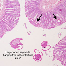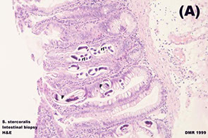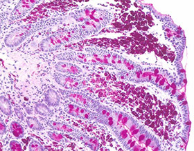 - (+) CEA on apical surface of villi and crypt cells, in goblet cell mucin, and in glycocalyx.