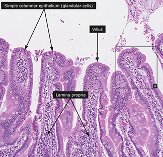 - each villi covered w/ surface epithelium and has core of lamina propria w/ blind-ending lymph channel (lacteal), VAN and lymphos