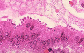 Villi: absorptive cell (columnar, eosinophilic cytoplasm) is major epithelial cell type found.