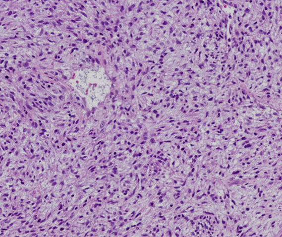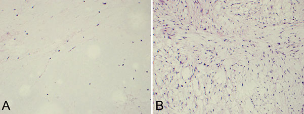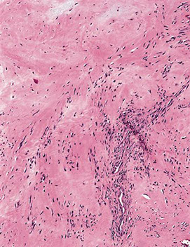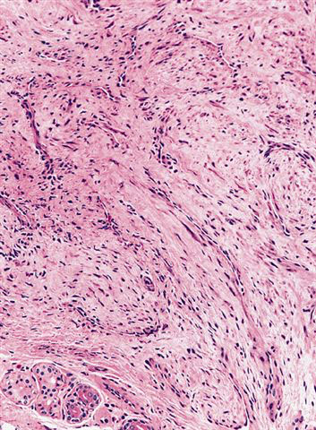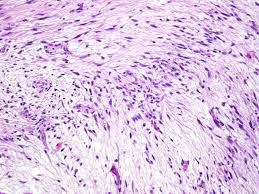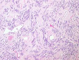 - bland uniform oval/spindle cells c little cytoplasm, small elongated nuclei no nucleoli in thin layers bwt collagen bands