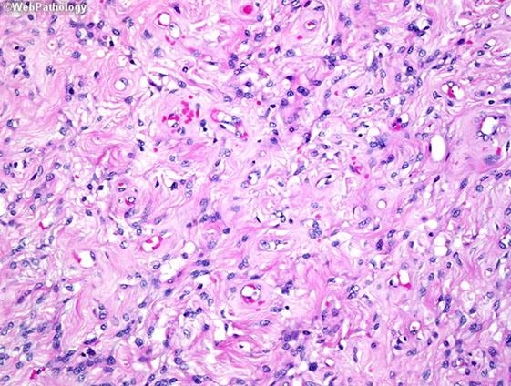 - originally thought to be derived from nerve sheath, now thought to come from fibroblasts with ability to differentiate to myofibroblasts and recruit histiocytes