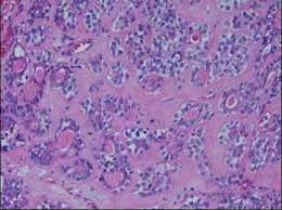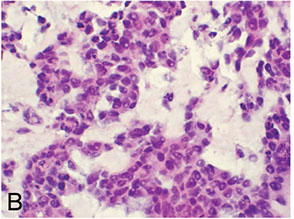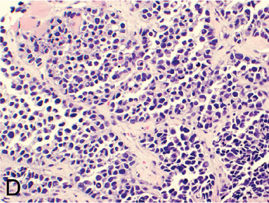 Micro: Sheets of polygonal, whorled, slightly fusiform cells with neuroid differentiation, mits and atypia