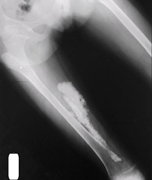 Imaging: round mass of intermediate density around large joints c spotty opacifications due to calcifications c 1/5 showing ossification or adjacent bone erosion