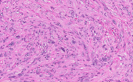 Micro: monomorphic snake-like cells c palisading,big vascular spaces, plump tumor cells around vessels, palisading necrosis (like GBM), freq mits, atypia, metaplastic cartilage, bone and muscle