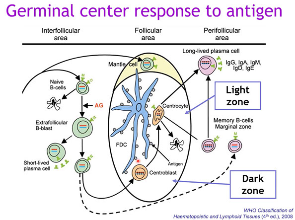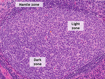 - has dark zone (centroblasts) and light zone (centrocytes)