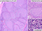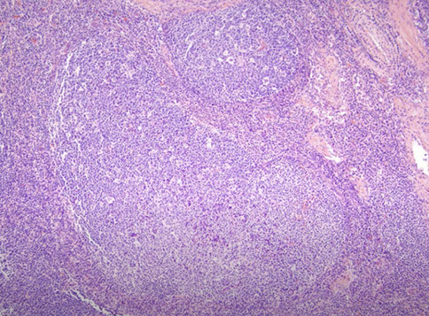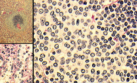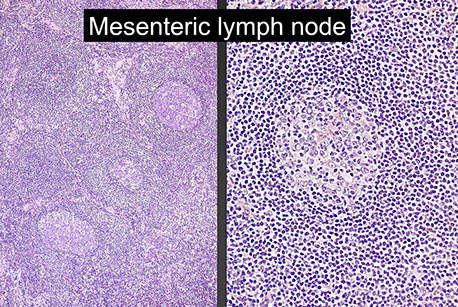 Marginal zone lymphoma in a mesenteric lymph node Left - follicles iwth GC, smaller mantle zone and paler peripheral zone, high mag (right) shows difficult to tell where mantle zone ends and marginal zone begins, bottom shows cells with pale cytoplasm and dispersed chromatin