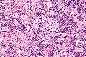 Classic SMZL, high mag showing the small lymphocytes of the central core in the white pulp nodule, and the cells in the marginal zone with more abundant pale cytoplasm that looks like normal splenic marginal zone cells and smaller lymphocytes in the red pulp