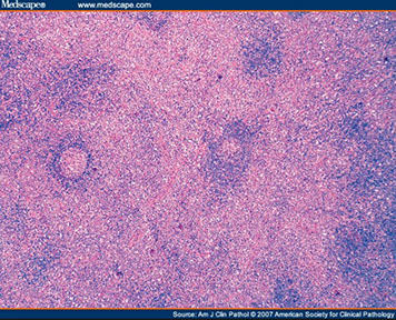 A classic case of SMZL, at higher mag, see the darker central core with lighter marginal zone, with a larger number of smaller lymphs with less cytoplasm in the central cords, here there are too many lymphocytes in the red pulp to be considered normal