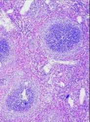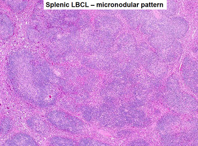 A classic case of SMZL, with increased and enlarged white pulp nodules, with dark central cores and paler peripheral marginal zones, also infiltration of the red pulp with little nodules and cells in the cores.