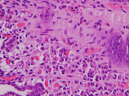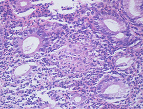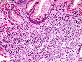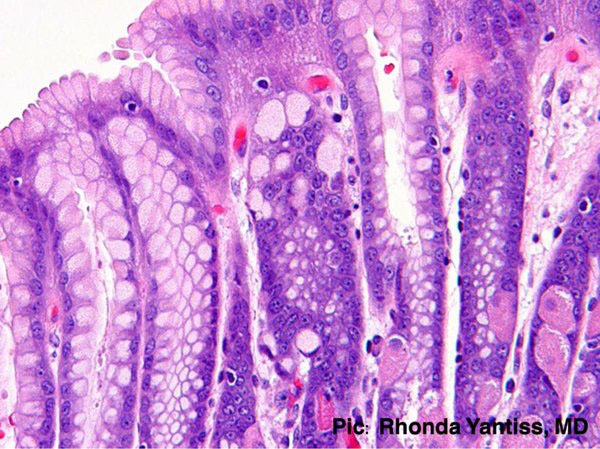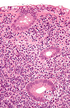 Micro: at low power, lamina propria expanded c small uniform cells, some of which have a "halo" around