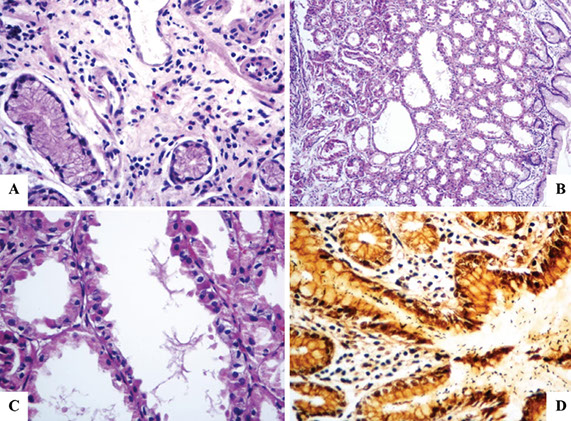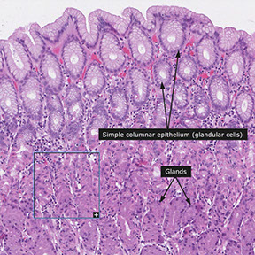 - lined c mucin-secreting foveolar cells forming small glands, also have endocrine cells (G cells) to stim luminal acid secretion by parietal cells in fundus and body