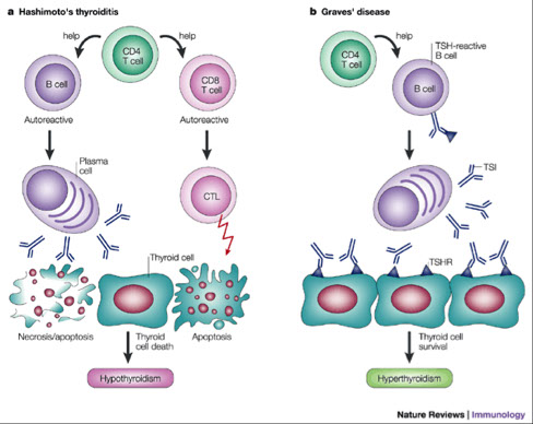 Graves’ – a result of activated B cells attaching to TSH receptors on follicular cells